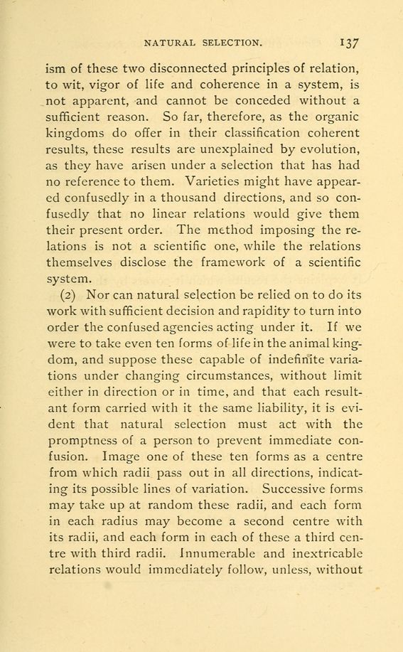 (2) Nor can natural selection be relied on to do its work with sufficient decision and rapidity to turn into order the confused agencies acting under it. If we were to take even ten forms of life in the animal kingdom, and suppose these capable of indefinite variations under changing circumstances, without limit either in direction or in time, and that each resultant form carried with it the same liability, it is evident that natural selection must act with the promptness of a person to prevent immediate confusion. Image one of these ten forms as a centre from which radii pass out in all directions, indicating its possible lines of variation. Successive forms may take up at random these radii, and each form in each radius may become a second centre with its radii, and each form in each of these a third centre with third radii. Innumerable and inextricable relations would immediately follow, unless, without
