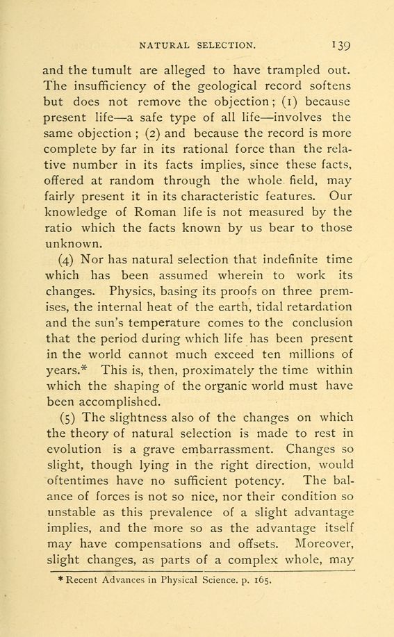 (4) Nor has natural selection that indefinite time which has been assumed wherein to work its changes. Physics, basing its proofs on three premises, the internal heat of the earth, tidal retardation and the sun's temperature comes to the conclusion that the period during which life has been present in the world cannot much exceed ten millions of years.* This is, then, proximately the time within which the shaping of the organic world must have been accomplished.