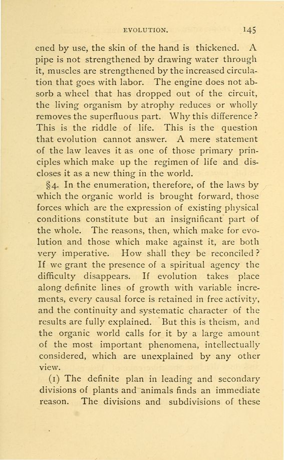 § 4. In the enumeration, therefore, of the laws by which the organic world is brought forward, those forces which are the expression of existing physical conditions constitute but an insignificant part of the whole. The reasons, then, which make for evolution and those which make against it, are both very imperative. How shall they be reconciled ? If we grant the presence of a spiritual agency the difficulty disappears. If evolution takes place along definite lines of growth with variable increments, every causal force is retained in free activity, and the continuity and systematic character of the results are fully explained. But this is theism, and the organic world calls for it by a large amount of the most important phenomena, intellectually considered, which are unexplained by any other view.