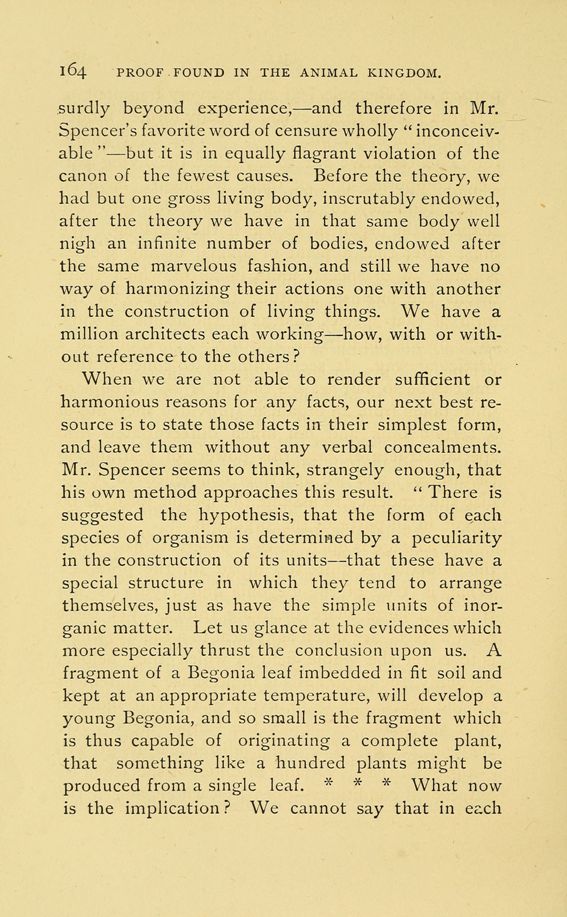 When we are not able to render sufficient or harmonious reasons for any facts, our next best resource is to state those facts in their simplest form, and leave them without any verbal concealments. Mr. Spencer seems to think, strangely enough, that his own method approaches this result. "There is suggested the hypothesis, that the form of each species of organism is determined by a peculiarity in the construction of its units --- that these have a special structure in which they tend to arrange themselves, just as have the simple units of inorganic matter. Let us glance at the evidences which more especially thrust the conclusion upon us. A fragment of a Begonia leaf imbedded in fit soil and kept at an appropriate temperature, will develop a young Begonia, and so small is the fragment which is thus capable of originating a complete plant, that something like a hundred plants might be produced from a single leaf. * * * What now is the implication? We cannot say that in each
