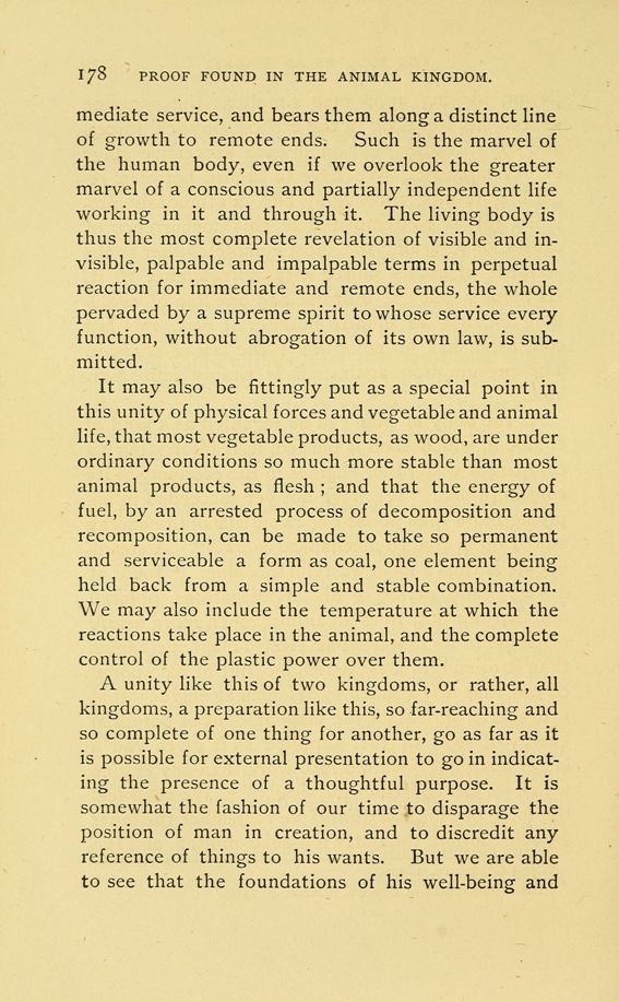 A unity like this of two kingdoms, or rather, all kingdoms, a preparation like this, so far-reaching and so complete of one thing for another, go as far as it is possible for external presentation to go in indicating the presence of a thoughtful purpose. It is somewhat the fashion of our time to disparage the position of man in creation, and to discredit any reference of things to his wants. But we are able to see that the foundations of his well-being and