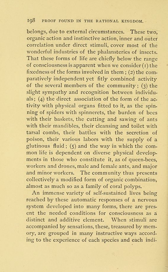 belongs, due to external circumstances. These two, organic action and instinctive action, inner and outer correlation under direct stimuli, cover most of the wonderful industries of the phalansteries of insects. That these forms of life are chiefly below the range of consciousness is apparent when we consider (1) the fixedness of the forms involved in them; (2) the comparatively independent yet fitly combined activity of the several members of the community; (3) the slight sympathy and recognition between individuals; (4) the direct association of the form of the activity with physical organs fitted to it, as the spinning of spiders with spinnerets, the burden of bees with their baskets, the cutting and sawing of ants with their mandibles, their cleansing and toilet with tarsal combs, their battles with the secretion of poison, their various labors with the supply of a glutinous fluid; (5) and the way in which the common life is dependent on diverse physical developments in those who constitute it, as of queen-bees, workers and drones, male and female ants, and major and minor workers. The community thus presents collectively a modified form of organic combination, almost as much so as a family of coral polyps.