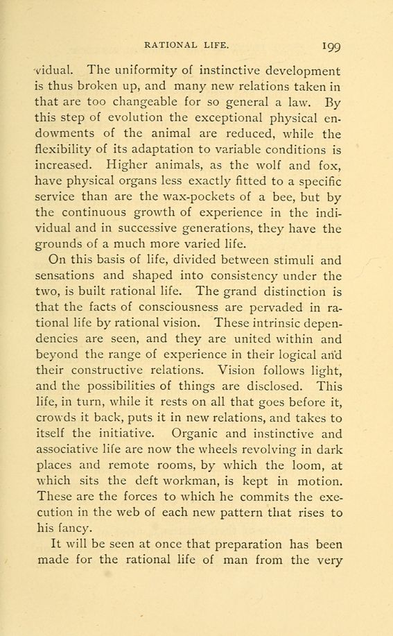 On this basis of life, divided between stimuli and sensations and shaped into consistency under the two, is built rational life. The grand distinction is that the facts of consciousness are pervaded in rational life by rational vision. These intrinsic dependencies are seen, and they are united within and beyond the range of experience in their logical and their constructive relations. Vision follows light, and the possibilities of things are disclosed. This life, in turn, while it rests on all that goes before it, crowds it back, puts it in new relations, and takes to itself the initiative. Organic and instinctive and associative life are now the wheels revolving in dark places and remote rooms, by which the loom, at which sits the deft workman, is kept in motion. These are the forces to which he commits the execution in the web of each new pattern that rises to his fancy.