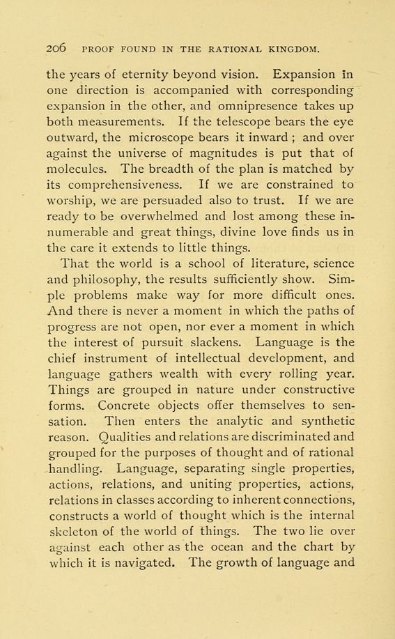 That the world is a school of literature, science and philosophy, the results sufficiently show. Simple problems make way for more difficult ones. And there is never a moment in which the paths of progress are not open, nor ever a moment in which the interest of pursuit slackens. Language is the chief instrument of intellectual development, and language gathers wealth with every rolling year. Things are grouped in nature under constructive forms. Concrete objects offer themselves to sensation. Then enters the analytic and synthetic reason. Qualities and relations are discriminated and grouped for the purposes of thought and of rational handling. Language, separating single properties, actions, relations, and uniting properties, actions, relations in classes according to inherent connections, constructs a world of thought which is the internal skeleton of the world of things. The two lie over against each other as the ocean and the chart by which it is navigated. The growth of language and