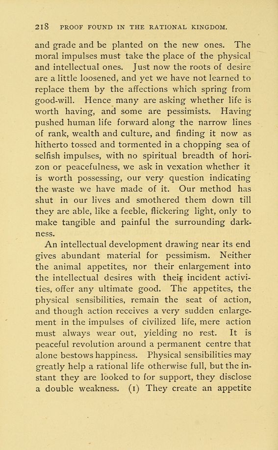and grade and be planted on the new ones. The moral impulses must take the place of the physical and intellectual ones. Just now the roots of desire are a little loosened, and yet we have not learned to replace them by the affections which spring from good-will. Hence many are asking whether life is worth having, and some are pessimists. Having pushed human life forward along the narrow lines of rank, wealth and culture, and finding it now as hitherto tossed and tormented in a chopping sea of selfish impulses, with no spiritual breadth of horizon or peacefulness, we ask in vexation whether it is worth possessing, our very question indicating the waste we have made of it. Our method has shut in our lives and smothered them down till they are able, like a feeble, flickering light, only to make tangible and painful the surrounding darkness.