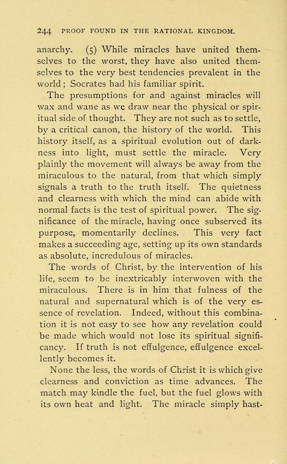 The words of Christ, by the intervention of his life, seem to be inextricably interwoven with the miraculous. There is in him that fulness of the natural and supernatural which is of the very essence of revelation. Indeed, without this combination it is not easy to see how any revelation could be made which would not lose its spiritual significancy. If truth is not effulgence, effulgence excellently becomes it.