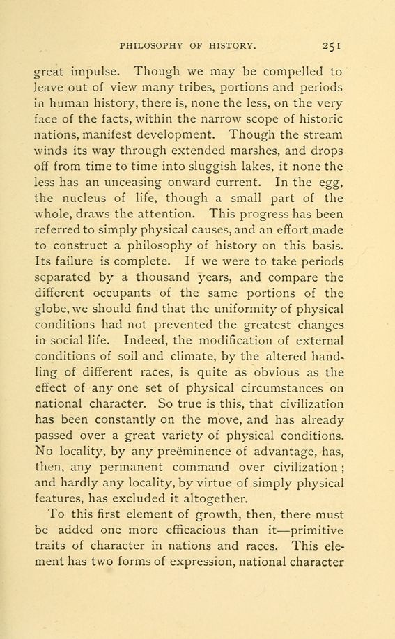 great impulse. Though we may be compelled to leave out of view many tribes, portions and periods in human history, there is, none the less, on the very face of the facts, within the narrow scope of historic nations, manifest development. Though the stream winds its way through extended marshes, and drops off from time to time into sluggish lakes, it none the less has an unceasing onward current. In the egg, the nucleus of life, though a small part of the whole, draws the attention. This progress has been referred to simply physical causes, and an effort made to construct a philosophy of history on this basis. Its failure is complete. If we were to take periods separated by a thousand years, and compare the different occupants of the same portions of the globe, we should find that the uniformity of physical conditions had not prevented the greatest changes in social life. Indeed, the modification of external conditions of soil and climate, by the altered handling of different races, is quite as obvious as the effect of any one set of physical circumstances on national character. So true is this, that civilization has been constantly on the move, and has already passed over a great variety of physical conditions. No locality, by any preeminence of advantage, has, then, any permanent command over civilization; and hardly any locality, by virtue of simply physical features, has excluded it altogether.