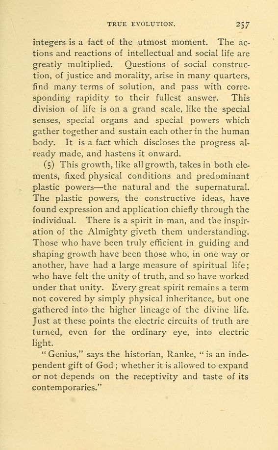 (5) This growth, like all growth, takes in both elements, fixed physical conditions and predominant plastic powers --- the natural and the supernatural. The plastic powers, the constructive ideas, have found expression and application chiefly through the individual. There is a spirit in man, and the inspiration of the Almighty giveth them understanding. Those who have been truly efficient in guiding and shaping growth have been those who, in one way or another, have had a large measure of spiritual life; who have felt the unity of truth, and so have worked under that unity. Every great spirit remains a term not covered by simply physical inheritance, but one gathered into the higher lineage of the divine life. Just at these points the electric circuits of truth are turned, even for the ordinary eye, into electric light.