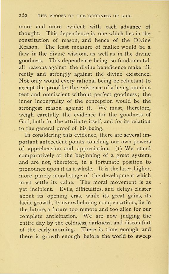 more and more evident with each advance of thought. This dependence is one which lies in the constitution of reason, and hence of the Divine Reason. The least measure of malice would be a flaw in the divine wisdom, as well as in the divine goodness. This dependence being so fundamental, all reasons against the divine beneficence make directly and strongly against the divine existence. Not only would every rational being be reluctant to accept the proof for the existence of a being omnipotent and omniscient without perfect goodness the inner incongruity of the conception would be the strongest reason against it. We must, therefore, weigh carefully the evidence for the goodness of God, both for the attribute itself, and for its relation to the general proof of his being.