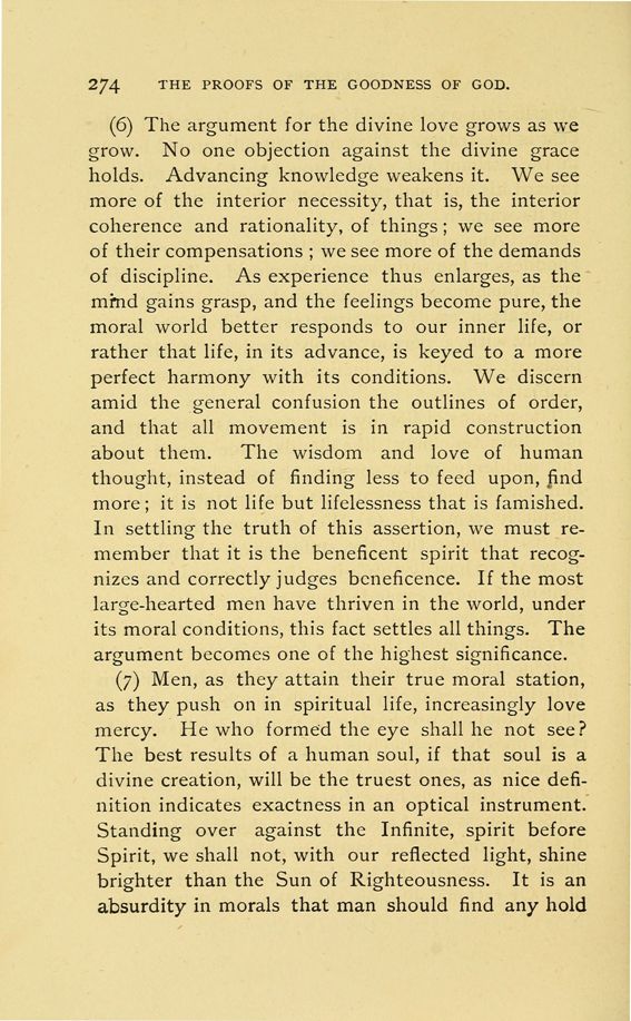 (6) The argument for the divine love grows as we grow. No one objection against the divine grace holds. Advancing knowledge weakens it. We see more of the interior necessity, that is, the interior coherence and rationality, of things; we see more of their compensations; we see more of the demands of discipline. As experience thus enlarges, as the mind gains grasp, and the feelings become pure, the moral world better responds to our inner life, or rather that life, in its advance, is keyed to a more perfect harmony with its conditions. We discern amid the general confusion the outlines of order, and that all movement is in rapid construction about them. The wisdom and love of human thought, instead of finding less to feed upon, find more; it is not life but lifelessness that is famished. In settling the truth of this assertion, we must remember that it is the beneficent spirit that recognizes and correctly judges beneficence. If the most large-hearted men have thriven in the world, under its moral conditions, this fact settles all things. The argument becomes one of the highest significance.