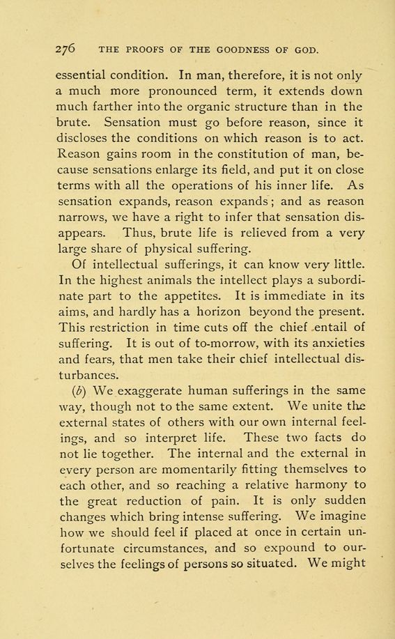 essential condition. In man, therefore, it is not only a much more pronounced term, it extends down much farther into the organic structure than in the brute. Sensation must go before reason, since it discloses the conditions on which reason is to act. Reason gains room in the constitution of man, because sensations enlarge its field, and put it on close terms with all the operations of his inner life. As sensation expands, reason expands and as reason narrows, we have a right to infer that sensation disappears. Thus, brute life is relieved from a very large share of physical suffering.