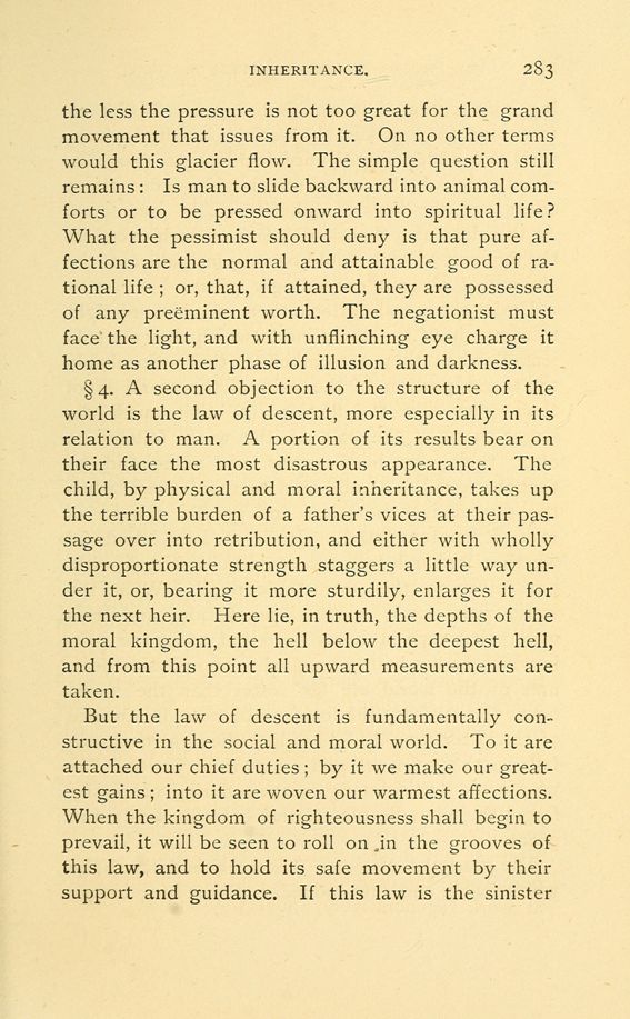 § 4. A second objection to the structure of the world is the law of descent, more especially in its relation to man. A portion of its results bear on their face the most disastrous appearance. The child, by physical and moral inheritance, takes up the terrible burden of a father's vices at their passage over into retribution, and either with wholly disproportionate strength staggers a little way under it, or, bearing it more sturdily, enlarges it for the next heir. Here lie, in truth, the depths of the moral kingdom, the hell below the deepest hell, and from this point all upward measurements are taken.
