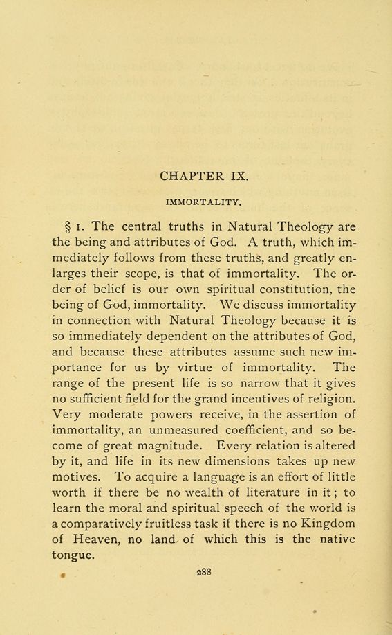§ 1. The central truths in Natural Theology are the being and attributes of God. A truth, which immediately follows from these truths, and greatly enlarges their scope, is that of immortality. The order of belief is our own spiritual constitution, the being of God, immortality. We discuss immortality in connection with Natural Theology because it is so immediately dependent on the attributes of God, and because these attributes assume such new importance for us by virtue of immortality. The range of the present life is so narrow that it gives no sufficient field for the grand incentives of religion. Very moderate powers receive, in the assertion of immortality, an unmeasured coefficient, and so become of great magnitude. Every relation is altered by it, and life in its new dimensions takes up new motives. To acquire a language is an effort of little worth if there be no wealth of literature in it; to learn the moral and spiritual speech of the world is a comparatively fruitless task if there is no Kingdom of Heaven, no land, of which this is the native tongue.