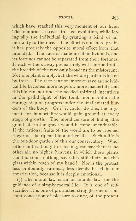 which have reached this very moment of our lives. The empiricist strives to save evolution, while letting slip the individual by granting a kind of immortality to the race. The effort is not merely vain, it has precisely the opposite moral effect from that intended. The race is made up of individuals, and its fortunes cannot be separated from their fortunes. If each withers away prematurely with unripe fruits, the breadth of the race only broadens the misfortune. Not one plant simply, but the whole garden is bitten by frost. The race can not improve save as individual life becomes more hopeful, more masterful; and this life can not find the needed spiritual incentives in the pallid light of the tomb, nor maintain the springy step of progress under the unalleviated burdens of the body. Or if it could do this, the argument for immortality would gain ground at every stage of growth. The moral censure of hiding this grand life in the grave would become unendurable. If the rational fruits of the world are to be ripened they must be ripened in another life. Such a life is the out-door garden of this our conservatory. Who, either in his thought or feeling, can say there is no other air, no higher heavens, in which these plants can blossom; nothing save this stifled air and this glass within reach of my hand! Nor is the protest less profoundly rational, less deeply based in our constitution, because it is deeply emotional.