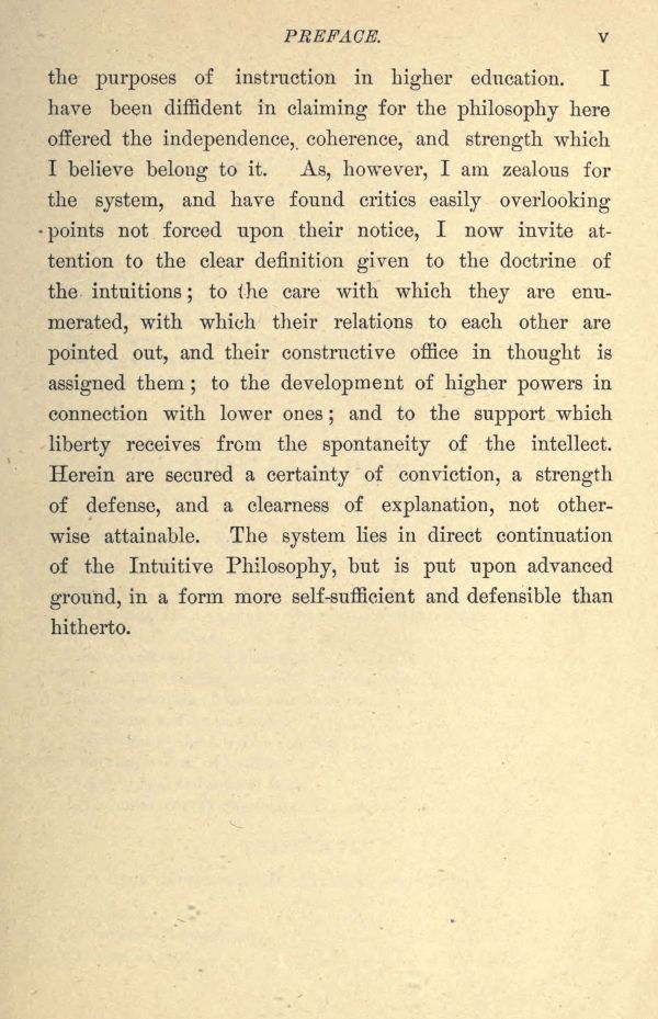 the purposes of instruction in higher education. I have been diffident in claiming for the philosophy here offered the independence, coherence, and strength which I believe belong to it. As, however, I am zealous for the system, and have found critics easily overlooking points not forced upon their notice, I now invite attention to the clear definition given to the doctrine of the intuitions; to the care with which they are enumerated, with which their relations to each other are pointed out, and their constructive office in thought is assigned them; to the development of higher powers in connection with lower ones; and to the support which liberty receives from the spontaneity of the intellect. Herein are secured a certainty of conviction, a strength of defense, and a clearness of explanation, not otherwise attainable. The system lies in direct continuation of the Intuitive Philosophy, but is put upon advanced ground, in a form more self-sufficient and defensible than hitherto.