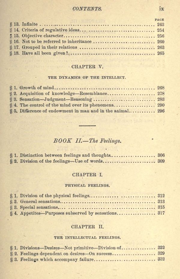Introduction - Intellect - Mental Science's Divisions - Intellect's Divisions and Perceptions - The Understanding - The Reason - The Dynamics of the Intellect - Physical Feelings - Intellectual Feelings - Spiritual Feelings - Dynamics of Feelings - The Will - The Nervous System - Nervous System of Man - Executive Volition - Primary Volition, or Choice - Dynamics of the Will and the Mind - The Relations of the Systems Here Offered to Prevalent Forms of Philosophy - Index - Contents -