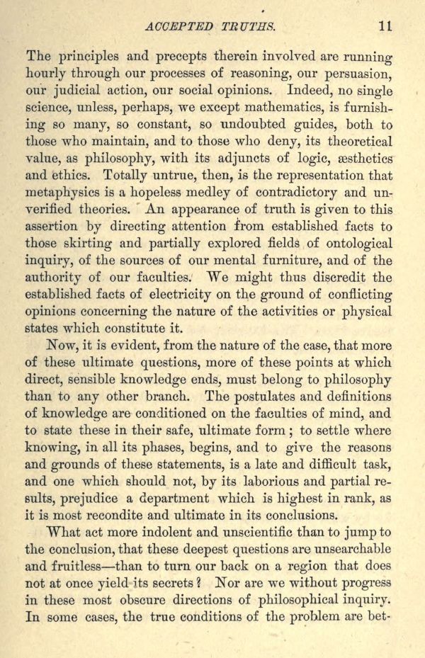 The principles and precepts therein involved are running hourly through our processes of reasoning, our persuasion, our judicial action, our social opinions. Indeed, no single science, unless, perhaps, we except mathematics, is furnishing so many, so constant, so undoubted guides, both to those who maintain, and to those who deny, its theoretical value, as philosophy, with its adjuncts of logic, aesthetics and ethics. Totally untrue, then, is the representation that metaphysics is a hopeless medley of contradictory and unverified theories. An appearance of truth is given to this assertion by directing attention from established facts to those skirting and partially explored fields of ontological inquiry, of the sources of our mental furniture, and of the authority of our faculties. We might thus discredit the established facts of electricity on the ground of conflicting opinions concerning the nature of the activities or physical states which constitute it.