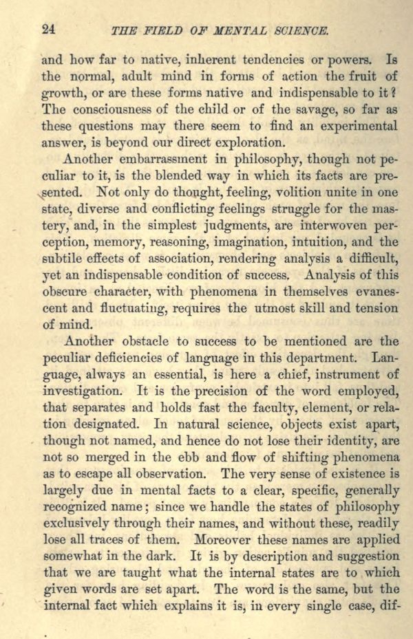 Another obstacle to success to be mentioned are the peculiar deficiencies of language in this department. Language, always an essential, is here a chief, instrument of investigation. It is the precision of the word employed, that separates and holds fast the faculty, element, or relation designated. In natural science, objects exist apart, though not named, and hence do not lose their identity, are not so merged in the ebb and flow of shifting phenomena as to escape all observation. The very sense of existence is largely due in mental facts to a clear, specific, generally recognized name; since we handle the states of philosophy exclusively through their names, and without these, readily lose all traces of them. Moreover these names are applied somewhat in the dark. It is by description and suggestion that we are taught what the internal states are to which given words are set apart. The word is the same, but the internal fact which explains it is, in every single case, different,