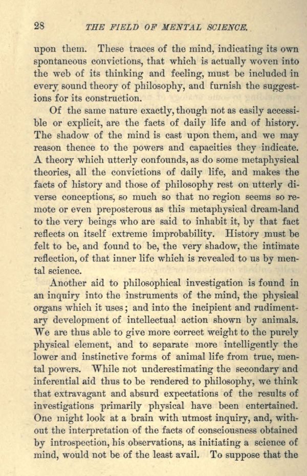 Another aid to philosophical investigation is found in an inquiry into the instruments of the mind, the physical organs which it uses; and into the incipient and rudimentary development of intellectual action shown by animals. We are thus able to give more correct weight to the purely physical element, and to separate more intelligently the lower and instinctive forms of animal life from true, mental powers. While not underestimating the secondary and inferential aid thus to be rendered to philosophy, we think that extravagant and absurd expectations of the results of investigations primarily physical have been entertained. One might look at a brain with utmost inquiry, and, without the interpretation of the facts of consciousness obtained by introspection, his observations, as initiating a science of mind, would not be of the least avail. To suppose that the