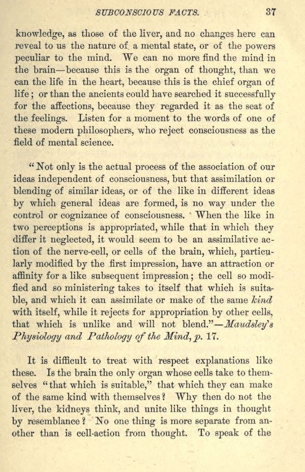 "Not only is the actual process of the association of our ideas independent of consciousness, but that assimilation or blending of similar ideas, or of the like in different ideas by which general ideas are formed, is no way under the control or cognizance of consciousness." When the like in two perceptions is appropriated, while that in which they differ it neglected, it would seem to be an assimilative action of the nerve-cell, or cells of the brain, which, particularly modified by the first impression, have an attraction or affinity for a like subsequent impression; the cell so modified and so ministering takes to itself that which is suitable, and which it can assimilate or make of the same kind with itself, while it rejects for appropriation by other cells, that which is unlike and will not blend." --- Maudsley's Physiology and Pathology of the Mind, p. 17.