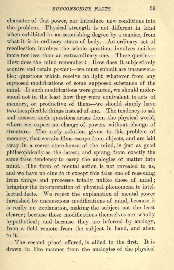 character of that power, nor introduce new conditions into the problem. Physical strength is not different in kind when exhibited in an astonishing degree by a maniac, from what it is in ordinary states of body. An ordinary act of recollection involves the whole question, involves neither more nor less than an extraordinary one. These queries How does the mind remember? How does it subjectively acquire and retain power? we must submit are unanswerable; questions which receive no light whatever from any supposed modifications of some supposed substance of the mind. If such modifications were granted, we should understand not in the least how they were equivalent to acts of memory, or productive of them we should simply have two inexplicable things instead of one. The tendency to ask and answer such questions arises from the physical world, where we expect no change of powers without change of structure. The early solution given to this problem of memory, that certain films escape from objects, and are laid away in a secret store-house of the mind, is just as good philosophically as the latest; and sprang from exactly the same false tendency to carry the analogies of matter into mind. The form of mental action is not revealed to us, and we have no clue to it except this false one of reasoning from things and processes totally unlike those of mind; bringing the interpretation of physical phenomena to intellectual facts. We reject the explanation of mental power furnished by unconscious modifications of mind, because it is really no explanation, making the subject not the least clearer; because these modifications themselves are wholly hypothetical; and because they are inferred by analogy, from a field remote from the subject in hand, and alien to it.