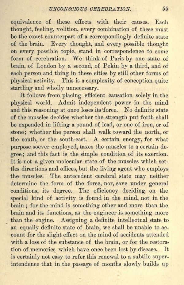 It follows from placing efficient causation solely in the physical world. Admit independent power in the mind and this reasoning at once loses its force. No definite state of the muscles decides whether the strength put forth shall be expended in lifting a pound of lead, or one of iron, or of stone; whether the person shall walk toward the north, or the south, or the south-east. A certain energy, for what purpose soever employed, taxes the muscles to a certain degree; and this fact is the simple condition of its exertion. It is not a given molecular state of the muscles which settles directions and offices, but the living agent who employs the muscles. The antecedent cerebral state may neither determine the form of the force, nor, save under general conditions, its degree. The efficiency deciding on the special kind of activity is found in the mind, not in the brain; for the mind is something other and more than the brain and its functions, as the engineer is something more than the engine. Assigning a definite intellectual state to an equally definite state of brain, we shall be unable to account for the slight effect on the mind of accidents attended with a loss of the substance of the brain, or for the restoration of memories which have once been lost by disease. It is certainly not easy to refer this renewal to a subtile superintendence that in the passage of months slowly builds up