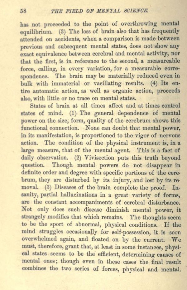 States of brain at all times affect and at times control states of mind. (1) The general dependence of mental power on the size, form, quality of the cerebrum shows this functional connection. None can doubt that mental power, in its manifestation, is proportioned to the vigor of nervous action. The condition of the physical instrument is, in a large measure, that of the mental agent. This is a fact of daily observation. (2) Vivisection puts this truth beyond question. Though mental powers do not disappear in definite order and degree with specific portions of the cerebrum, they are disturbed by its injury, and lost by its removal. (3) Diseases of the brain complete the proof. Insanity, partial hallucinations in a great variety of forms, are the constant accompaniments of cerebral disturbance. Not only does such disease diminish mental power, it strangely modifies that which remains. The thoughts seem to be the sport of abnormal, physical conditions. If the mind struggles occasionally for self-possession, it is soon overwhelmed again, and floated on by the current. We must, therefore, grant that, at least in some instances, physical states seems to be the efficient, determining causes of mental ones; though even in these cases the final result combines the two series of forces, physical and mental.