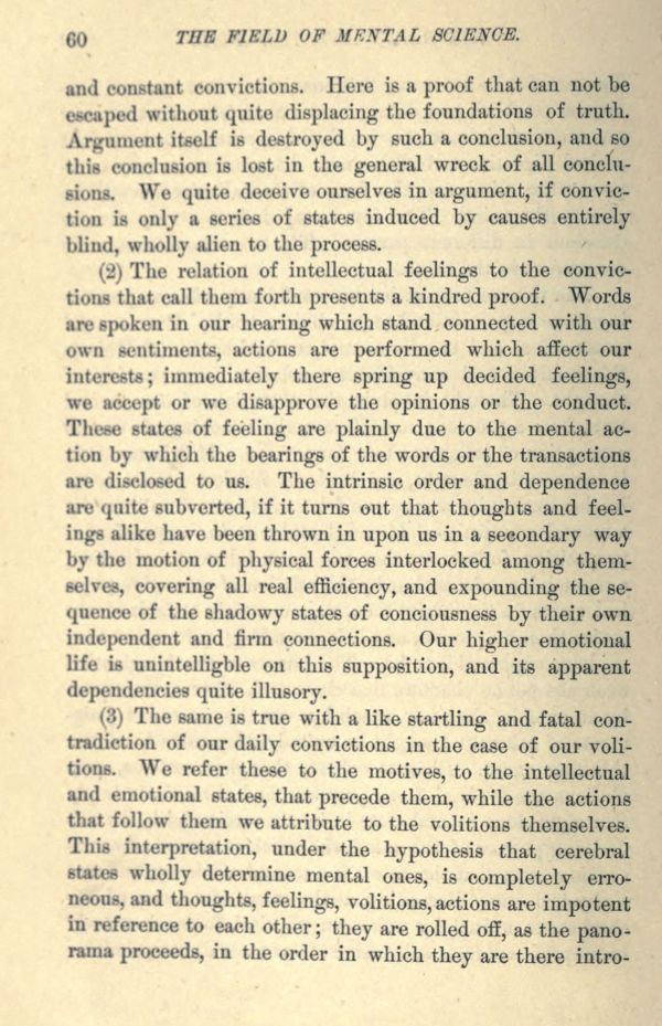 (3) The same is true with a like startling and fatal contradiction of our daily convictions in the case of our volitions. We refer these to the motives, to the intellectual and emotional states, that precede them, while the actions that follow them we attribute to the volitions themselves. This interpretation, under the hypothesis that cerebral states wholly determine mental ones, is completely erroneous, and thoughts, feelings, volitions, actions are impotent in reference to each other; they are rolled off, as the panorama proceeds, in the order in which they are there introduced,