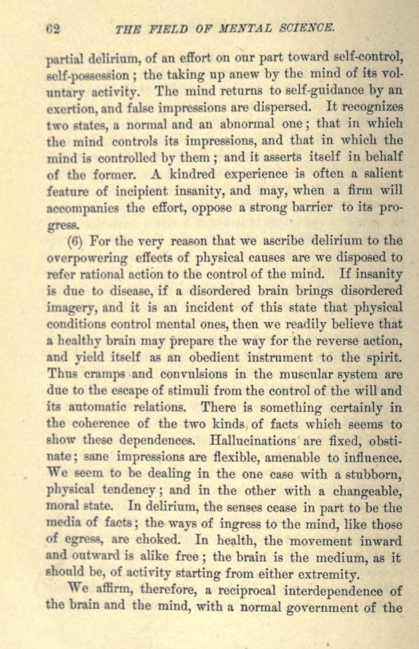 (6) For the very reason that we ascribe delirium to the overpowering effects of physical causes are we disposed to refer rational action to the control of the mind. If insanity is due to disease, if a disordered brain brings disordered imagery, and it is an incident of this state that physical conditions control mental ones, then we readily believe that a healthy brain may prepare the way for the reverse action, and yield itself as an obedient instrument to the spirit. Thus cramps and convulsions in the muscular system are due to the escape of stimuli from the control of the will and its automatic relations. There is something certainly in the coherence of the two kinds of facts which seems to show these dependences. Hallucinations are fixed, obstinate; sane impressions are flexible, amenable to influence. We seem to be dealing in the one case with a stubborn, physical tendency; and in the other with a changeable, moral state. In delirium, the senses cease in part to be the media of facts; the ways of ingress to the mind, like those of egress, are choked. In health, the movement inward and outward is alike free; the brain is the medium, as it should be, of activity starting from either extremity.