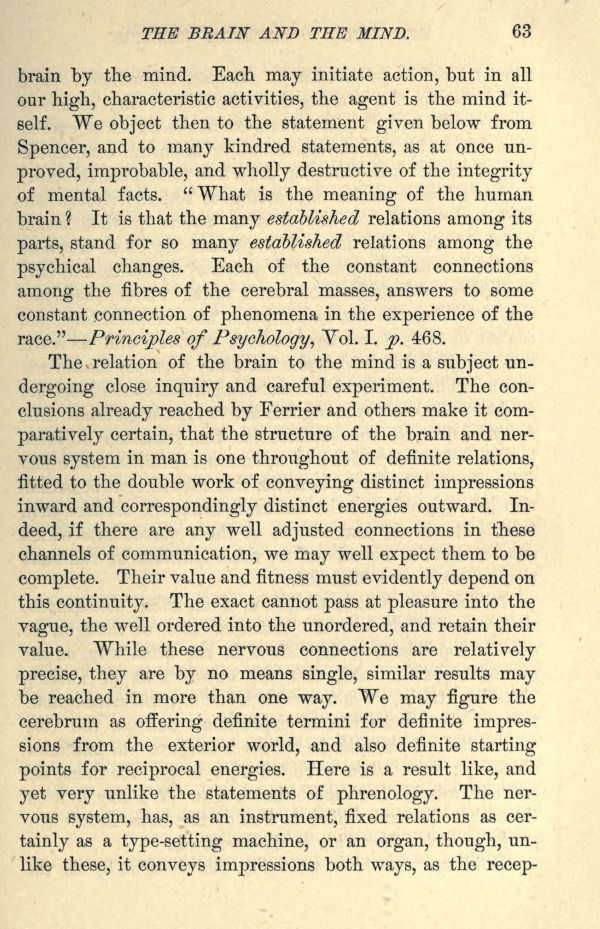brain by the mind. Each may initiate action, but in all our high, characteristic activities, the agent is the mind itself. We object then to the statement given below from Spencer, and to many kindred statements, as at once unproved, improbable, and wholly destructive of the integrity of mental facts. "What is the meaning of the human brain? It is that the many established relations among its parts, stand for so many established relations among the psychical changes. Each of the constant connections among the fibres of the cerebral masses, answers to some constant connection of phenomena in the experience of the race." Principles of Psychology, Vol. I. p. 468.