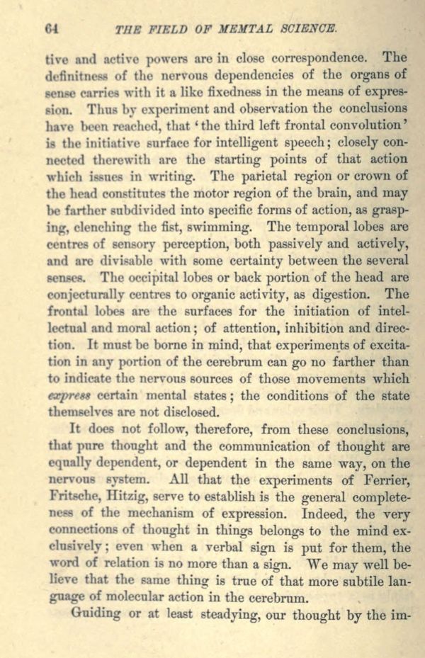 It does not follow, therefore, from these conclusions, that pure thought and the communication of thought are equally dependent, or dependent in the same way, on the nervous system. All that the experiments of Ferrier, Friteche, Hitzig, serve to establish is the general completeness of the mechanism of expression. Indeed, the very connections of thought in things belongs to the mind exclusively: even when a verbal sign is put for them, the word of relation is no more than a sign. We may well believe that the same thing is true of that more subtile language of molecular action in the cerebrum.