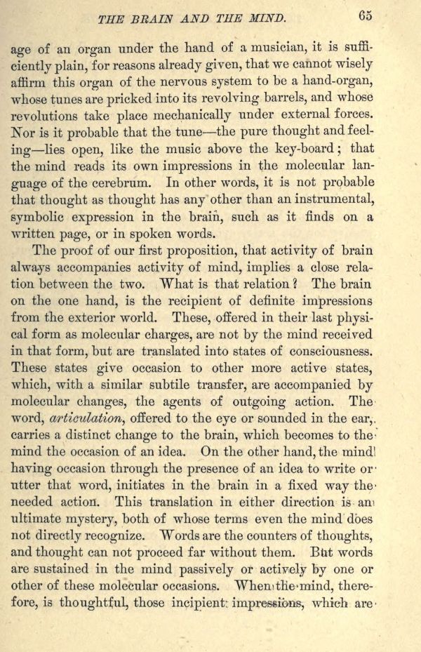 The proof of our first proposition, that activity of brain always accompanies activity of mind, implies a close relation between the two. What is that relation? The brain on the one hand, is the recipient of definite impressions from the exterior world. These, offered in their last physical form as molecular charges, are not by the mind received in that form, but are translated into states of consciousness. These states give occasion to other more active states, which, with a similar subtile transfer, are accompanied by molecular changes, the agents of outgoing action. The word, articulation, offered to the eye or sounded in the ear,, carries a distinct change to the brain, which becomes to the' mind the occasion of an idea. On the other hand, the mind! having occasion through the presence of an idea to write or utter that word, initiates in the brain in a fixed way the needed action. This translation in either direction is am ultimate mystery, both of whose terms even the mind does not directly recognize. "Words are the counters of thoughts, and thought can not proceed far without them. But words are sustained in the mind passively or actively by one or other of these molecular occasions. When the mind, therefore, is thoughtful, those incipient: impressions, which are