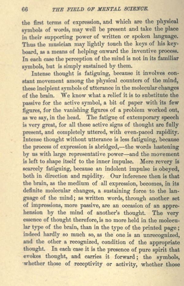 Intense thought is fatiguing, because it involves constant movement among the physical counters of the mind, these incipient symbols of utterance in the molecular changes of the brain. We know what a relief it is to substitute the passive for the active symbol, a bit of paper with its few figures, for the vanishing figures of a problem worked out, as we say, in the head. The fatigue of extemporary speech is very great, for all these active signs of thought are fully present, and completely uttered, with even-paced rapidity. Intense thought without utterance is less fatiguing, because the process of expression is abridged, the words hastening by us with large representative power and the movement is left to shape itself to the inner impulse. Mere revery is scarcely fatiguing, because an indolent impulse is obeyed, both in direction and rapidity. Our inference then is that the brain, as the medium of all expression, becomes, in its definite molecular changes, a sustaining force to the language of the mind; as written words, through another set of impressions, more passive, are an occasion of an apprehension by the mind of another's thought. The very essence of thought therefore, is no more held in the molecular type of the brain, than in the type of the printed page; indeed hardly so much so, as the one is an unrecognized, and the other a recognized, condition of the appropriate thought. In each case it is the presence of pure spirit that evokes thought, and carries it forward; the symbols, whether those of receptivity or activity, whether those