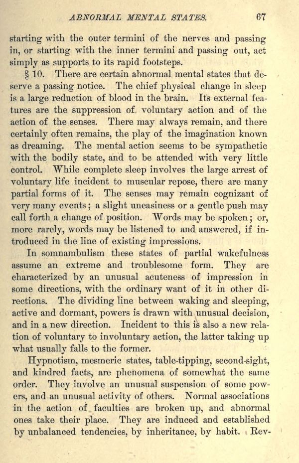 10. There are certain abnormal mental states that deserve a passing notice. The chief physical change in sleep is a large reduction of blood in the brain. Its external features are the suppression of voluntary action and of the action of the senses. There may always remain, and there certainly often remains, the play of the imagination known as dreaming. The mental action seems to be sympathetic with the bodily state, and to be attended with very little control. While complete sleep involves the large arrest of voluntary life incident to muscular repose, there are many partial forms of it. The senses may remain cognizant of very many events; a slight uneasiness or a gentle push may call forth a change of position. "Words may be spoken; or, more rarely, words may be listened to and answered, if introduced in the line of existing impressions.