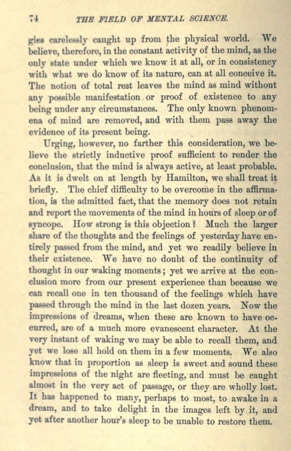 Urging, however, no farther this consideration, we believe the strictly inductive proof sufficient to render the conclusion, that the mind is always active, at least probable. As it is dwelt on at length by Hamilton, we shall treat it briefly. The chief difficulty to be overcome in the affirmation, is the admitted fact, that the memory does not retain and report the movements of the mind in hours of sleep or of syncope. How strong is this objection? Much the larger share of the thoughts and the feelings of yesterday have entirely passed from the mind, and yet we readily believe in their existence. "We have no doubt of the continuity of thought in our waking moments; yet we arrive at the conclusion more from our present experience than because we can recall one in ten thousand of the feelings which have passed through the mind in the last dozen years. Now the impressions of dreams, when these are known to have occurred, are of a much more evanescent character. At the very instant of waking we may be able to recall them, and yet we lose all hold on them in a few moments. We also know that in proportion as sleep is sweet and sound these impressions of the night are fleeting, and must be caught almost in the very act of passage, or they are wholly lost. It has happened to many, perhaps to most, to awake in a dream, and to take delight in the images left by it, and yet after another hour's sleep to be unable to restore them.
