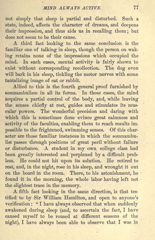 A third fact looking to the same conclusion is the familiar one of talking in sleep, though the person on waking retains none of the impressions which occupied the mind. In such cases, mental activity is fairly shown to exist without corresponding recollection. The dog even will bark in his sleep, tickling the motor nerves with some tantalizing image of cat or rabbit.