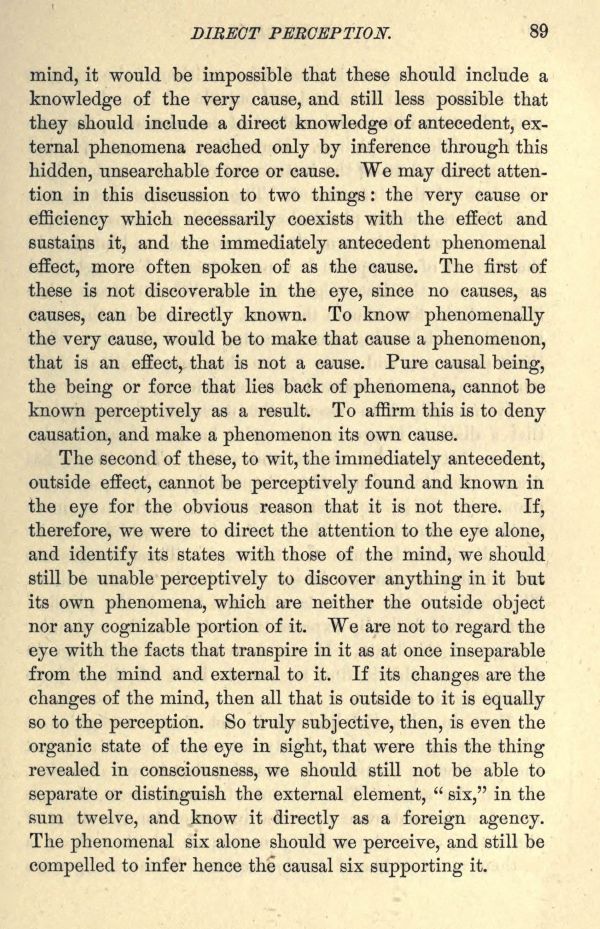 mind, it would be impossible that these should include a knowledge of the very cause, and still less possible that they should include a direct knowledge of antecedent, external phenomena reached only by inference through this hidden, unsearchable force or cause. We may direct attention in this discussion to two things: the very cause or efficiency which necessarily coexists with the effect and sustains it, and the immediately antecedent phenomenal effect, more often spoken of as the cause. The first of these is not discoverable in the eye, since no causes, as causes, can be directly known. To know phenomenally the very cause, would be to make that cause a phenomenon, that is an effect, that is not a cause. Pure causal being, the being or force that lies back of phenomena, cannot be known perceptively as a result. To affirm this is to deny causation, and make a phenomenon its own cause.