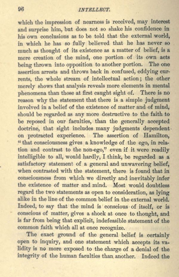 which the impression of nearness is received, may interest and surprise him, but does not so shake his confidence in his own conclusions as to be told that the external world, in which he has so fully believed that he has never so much as thought of its existence as a matter of belief, is a mere creation of the mind, one portion of its own acts being thrown into opposition to another portion. The one assertion arrests and throws back in confused, eddying currents, the whole stream of intellectual action; the other merely shows that analysis reveals more elements in mental phenomena than those at first caught sight of. There is no reason why the statement that there is a simple judgment involved in a belief of the existence of matter and of mind, should be regarded as any more destructive to the faith to be reposed in our faculties, than the generally accepted doctrine, that sight includes many judgments dependent on protracted experience. The assertion of Hamilton, "that consciousness gives a knowledge of the ego, in relation and contrast to the non-ego," even if it were readily intelligible to all, would hardly, I think, be regarded as a satisfactory statement of a general and unwavering belief, when contrasted with the statement, there is found that in consciousness from which we directly and inevitably infer the existence of matter and mind. Most would doubtless regard the two statements as open to consideration, as lying alike in the line of the common belief in the external world. Indeed, to say that the mind is conscious of itself, or is conscious of matter, gives a shock at once to thought, and is far from being that explicit, indefeasible statement of the common faith which all at once recognize.