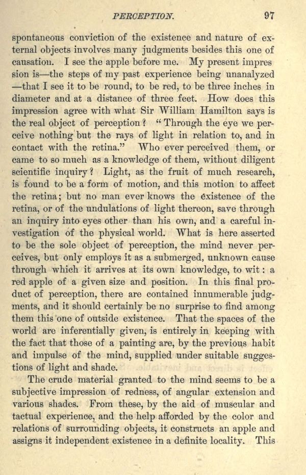 spontaneous conviction of the existence and nature of external objects involves many judgments besides this one of causation. I see the apple before me. My present impression is the steps of my past experience being unanalyzed that I see it to be round, to be red, to be three inches in diameter and at a distance of three feet. How does this impression agree with what Sir William Hamilton says is the real object of perception? " Through the eye we perceive nothing but the rays of light in relation to, and in contact with the retina." "Who ever perceived them, or came to so much as a knowledge of them, without diligent scientific inquiry? Light, as the fruit of much research, is found to be a form of motion, and this motion to affect the retina; but no man ever knows the existence of the retina, or of the undulations of light thereon, save through an inquiry into eyes other than his own, and a careful investigation of the physical world. What is here asserted to be the sole object of perception, the mind never perceives, but only employs it as a submerged, unknown cause through which it arrives at its own knowledge, to wit: a red apple of a given size and position. In this final product of perception, there are contained innumerable judgments, and it should certainly be no surprise to find among them this one of outside existence. That the spaces of the world are inferentially given, is entirely in keeping with the fact that those of a painting are, by the previous habit and impulse of the mind, supplied under suitable suggestions of light and shade.