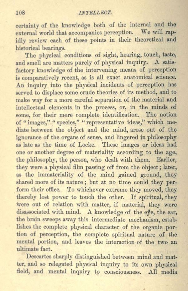 The physical conditions of sight, hearing, touch, taste, and smell are matters purely of physical inquiry. A satisfactory knowledge of the intervening means of perception is comparatively recent, as is all exact anatomical science. An inquiry into the physical incidents of perception has served to displace some crude theories of its method, and to make way for a more careful separation of the material and intellectual elements in the process, or, in the minds of some, for their more complete identification. The notion of "images," "species," "representative ideas," which mediate between the object and the mind, arose out of the ignorance of the organs of sense, and lingered in philosophy as late as the time of Locke. These images or ideas had one or another degree of materiality according to the age, the philosophy, the person, who dealt with them. Earlier, they were a physical film passing off from the object; later, as the immateriality of the mind gained ground, they shared more of its nature; but at no time could they perform their office. To whichever extreme they moved, they thereby lost power to touch the other. If spiritual, they were out of relation with matter, if material, they were disassociated with mind. A knowledge of the eye, the ear, the brain sweeps away this intermediate mechanism, establishes the complete physical character of the organic portion of perception, the complete spiritual nature of the mental portion, and leaves the interaction of the two an ultimate fact.