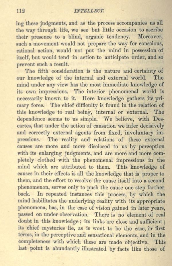 The fifth consideration is the nature and certainty of our knowledge of the internal and external world. The mind under any view has the most immediate knowledge of its own impressions. The interior phenomenal world is necessarily known to it. Here knowledge gathers its primary force. The chief difficulty is found in the relation of this knowledge to real being, internal or external. The dependence seems to us simple. We believe, with Descartes, that under the action of causation we infer decisively and correctly external agents from fixed, involuntary impressions. The reality and relations of these external causes are more and more disclosed to us by perception with its enlarging judgments, and are more and more completely clothed with the phenomenal impressions in the mind which are attributed to them. This knowledge of causes in their effects is all the knowledge that is proper to them, and the effort to resolve the cause itself into a second phenomenon, serves only to push the cause one step farther back. In repeated instances this process, by which the mind habilitates the underlying reality with its appropriate phenomena, has, in the case of vision gained in later years, passed on under observation. There is no element of real doubt in this knowledge; its links are close and sufficient; its chief mysteries lie, as is wont to be the case, in first terms, in the perceptive and sensational elements, and in the completeness with which these are made objective. This last point is abundantly illustrated by facts like those of