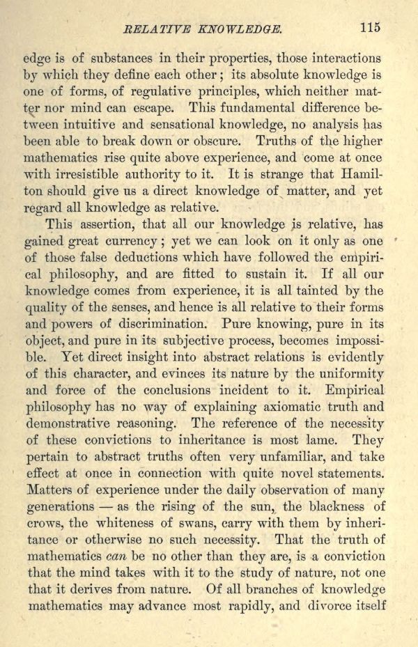 This assertion, that all our knowledge is relative, has gained great currency; yet we can look on it only as one of those false deductions which have followed the empirical philosophy, and are fitted to sustain it. If all our knowledge comes from experience, it is all tainted by the quality of the senses, and hence is all relative to their forms and powers of discrimination. Pure knowing, pure in its object, and pure in its subjective process, becomes impossible. Yet direct insight into abstract relations is evidently of this character, and evinces its nature by the uniformity and force of the conclusions incident to it. Empirical philosophy has no way of explaining axiomatic truth and demonstrative reasoning. The reference of the necessity of these convictions to inheritance is most lame. They pertain to abstract truths often very unfamiliar, and take effect at once in connection with quite novel statements. Matters of experience under the daily observation of many generations as the rising of the sun, the blackness of crows, the whiteness of swans, carry with them by inheritance or otherwise no such necessity. That the truth of mathematics can be no other than they are, is a conviction that the mind takes with it to the study of nature, not one that it derives from nature. Of all branches of knowledge mathematics may advance most rapidly, and divorce itself