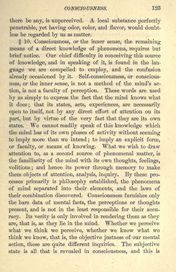 10. Consciousness, or the inner sense, the remaining means of a direct knowledge of phenomena, requires but brief notice. Our chief difficulty in conceiving this source of knowledge, and in speaking of it, is found in the language we are compelled to employ, and the confusion already occasioned by it. Self-consciousness, or consciousness, or the inner sense, is not a method of the mind's action, is not a faculty of perception. These words are used by us simply to express the fact that the mind knows what it does; that its states, acts, experiences, are necessarily open to itself, not by any direct effort of attention on its part, but by virtue of the very fact that they are its own states. We cannot readily speak of this knowledge which the mind has of its own phases of activity without seeming to imply more than we intend; to imply an explicit form, or faculty, or means of knowing. What we wish to draw attention to, as a second source of phenomenal matter, is the familiarity of the mind with its own thoughts, feelings, volitions; and hence its power through memory to make them objects of attention, analysis, inquiry. By these processes primarily is philosophy established, the phenomena of mind separated' into their elements, and the laws of their combination discovered. Consciousness furnishes only the bare data of mental facts, the perceptions or thoughts present, and is not in the least responsible for their accuracy. Its verity is only involved in rendering them as they are, that is, as they lie in the mind. Whether we perceive what we think we perceive, whether we know what we think we know, that is, the objective justness of our mental action, these are quite different inquiries. The subjective state is all that is revealed in consciousness, and this is