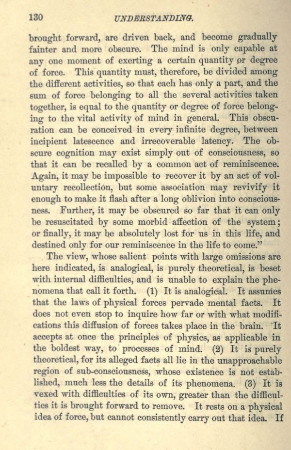The view, whose salient points with large omissions are here indicated, is analogical, is purely theoretical, is beset with internal difficulties, and is unable to explain the phenomena that call it forth. (1) It is analogical. It assumes that the laws of physical forces pervade mental facts. It does not even stop to inquire how far or with what modifications this diffusion of forces takes place in the brain. It accepts at once the principles of physics, as applicable in the boldest way, to processes of mind. (2) It is purely theoretical, for its alleged facts all lie in the unapproachable region of sub-consciousness, whose existence is not established, much less the details of its phenomena. (3) It is vexed with difficulties of its own, greater than the difficulties it is brought forward to remove. It rests on a physical idea of force, but cannot consistently carry out that idea. If
