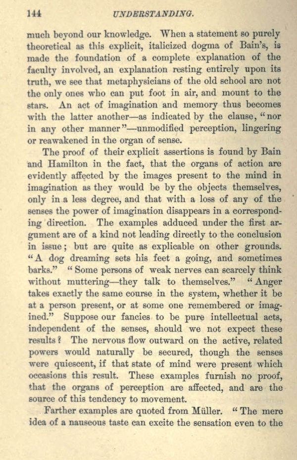 The proof of their explicit assertions is found by Bain and Hamilton in the fact, that the organs of action are evidently affected by the images present to the mind in imagination as they would be by the objects themselves, only in a less degree, and that with a loss of any of the senses the power of imagination disappears in a corresponding direction. The examples adduced under the first argument are of a kind not leading directly to the conclusion in issue; but are quite as explicable on other grounds. "A dog dreaming sets his feet a going, and sometimes barks." " Some persons of weak nerves can scarcely think without muttering they talk to themselves." " Anger takes exactly the same course in the system, whether it be at a person present, or at some one remembered or imagined." Suppose our fancies to be pure intellectual acts, independent of the senses, should we not expect these results? The nervous flow outward on the active, related powers would naturally be secured, though the senses were quiescent, if that state of mind were present which occasions this result. These examples furnish no proof, that the organs of perception are affected, and are the source of this tendency to movement.