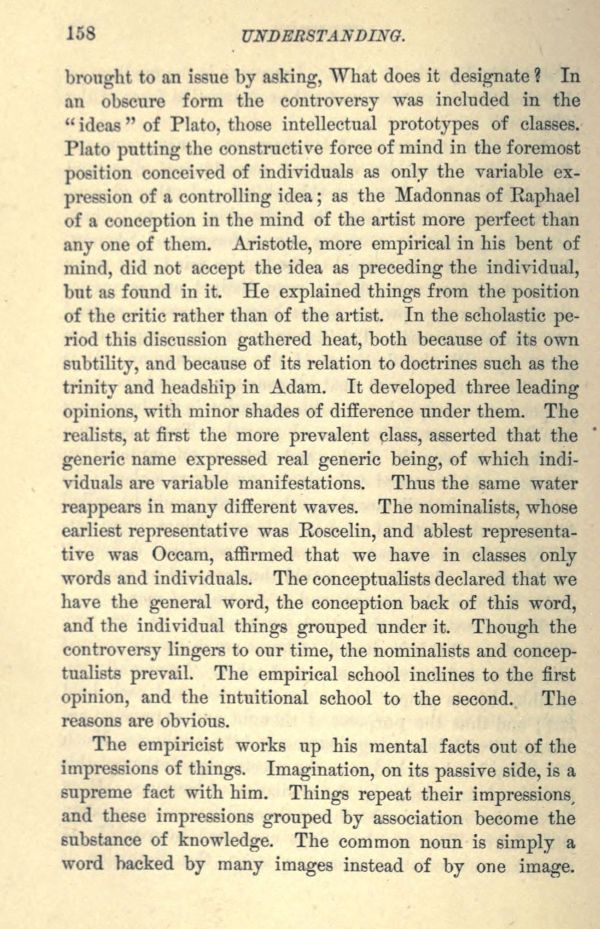 brought to an issue by asking, What does it designate? In an obscure form the controversy was included in the "ideas" of Plato, those intellectual prototypes of classes. Plato putting the constructive force of mind in the foremost position conceived of individuals as only the variable expression of a controlling idea; as the Madonnas of Raphael of a conception in the mind of the artist more perfect than any one of them. Aristotle, more empirical in his bent of mind, did not accept the idea as preceding the individual, but as found in it. He explained things from the position of the critic rather than of the artist. In the scholastic period this discussion gathered heat, both because of its own subtility, and because of its relation to doctrines such as the trinity and headship in Adam. It developed three leading opinions, with minor shades of difference under them. The realists, at first the more prevalent class, asserted that the generic name expressed real generic being, of which individuals are variable manifestations. Thus the same water reappears in many different waves. The nominalists, whose earliest representative was Roscelin, and ablest representative was Occam, affirmed that we have in classes only words and individuals. The conceptualists declared that we have the general word, the conception back of this word, and the individual things grouped under it. Though the controversy lingers to our time, the nominalists and conceptualists prevail. The empirical school inclines to the first opinion, and the intuitional school to the second. The reasons are obvious.