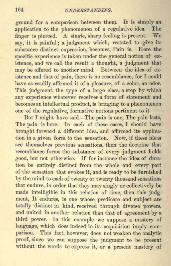 But I might have said The pain is one, The pain lasts, The pain is here. In each of these cases, I should have brought forward a different idea, and affirmed its application in a given form to the sensation. Now, if these ideas are themselves previous sensations, then the doctrine that resemblance forms the substance of every judgment holds good, but not otherwise. If for instance the idea of duration be entirely distinct from the whole and every part of the sensation that evokes it, and is ready to be furnished by the mind to each of twenty or twenty thousand sensations that endure, in order that they may singly or collectively be made intelligible in this relation of time, then this judgment, It endures, is one whose predicate and subject are totally distinct in kind, received through diverse powers, and united in another relation than that of agreement by a third power. In this example we suppose a mastery of language, which does indeed in its acquisition imply comparison. This fact, however, does not weaken the analytic proof, since we can suppose the judgment to be present without the words to express it, or a present mastery of