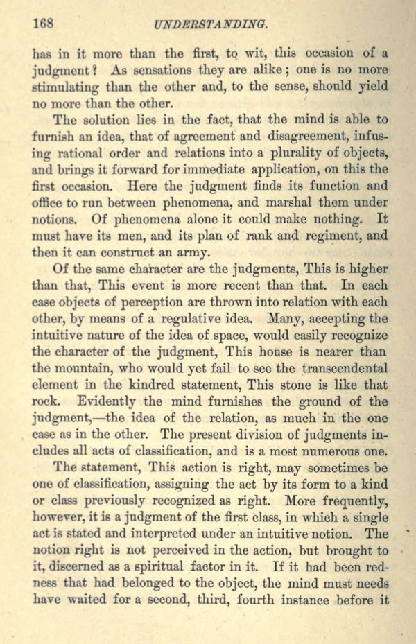 The solution lies in the fact, that the mind is able to furnish an idea, that of agreement and disagreement, infusing rational order and relations into a plurality of objects, and brings it forward for immediate application, on this the first occasion. Here the judgment finds its function and office to run between phenomena, and marshal them under notions. Of phenomena alone it could make nothing. It must have its men, and its plan of rank and regiment, and then it can construct an army.