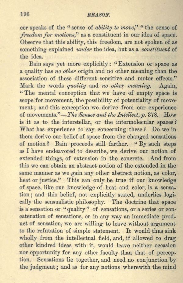 Bain says yet more explicitly: " Extension or space as a quality has no other origin and no other meaning than the association of these different sensitive and motor effects." Mark the words quality and no other meaning. Again, "The mental conception that we have of empty space is scope for movement, the possibility of potentiality of movement; and this conception we derive from our experience of movements." The Senses and the Intellect, p. 378. How is it as to the interstellar, or the intermolecular spaces? What has experience to say concerning these? Do we in them derive our belief of space from the changed sensations of motion? Bain proceeds still farther. "By such steps as I have endeavored to describe, we derive our notion of extended things, of extension in the concrete. And from this we can obtain an abstract notion of the extended in the same manner as we gain any other abstract notion, as color, heat or justice." This can only be true if our knowledge of space, like our knowledge of heat and color, is a sensation; and this belief, not explicitly stated, underlies logically the sensualistic philosophy. The doctrine that space is a sensation or "quality" of sensations, or a series or concatenation of sensations, or in any way an immediate product of sensation, we are willing to leave without argument to the refutation of simple statement. It would thus sink wholly from the intellectual field, and, if allowed to drag other kindred ideas with it, would leave neither occasion nor opportunity for any other faculty than that of perception. Sensations lie together, and need no conjunction by the judgment; and as for any notions wherewith the mind