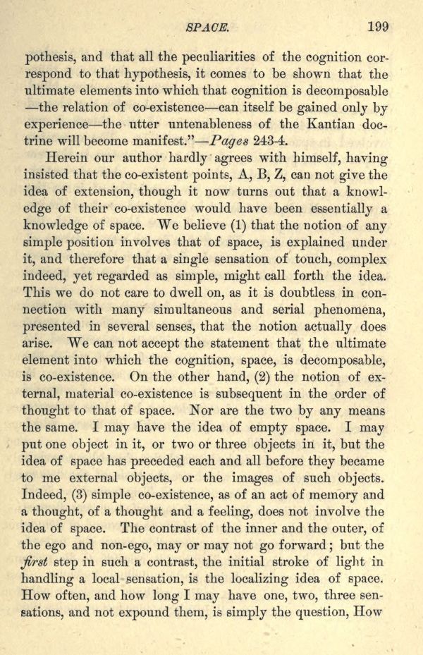 Herein our author hardly agrees with himself, having insisted that the co-existent points, A, B, Z, can not give the idea of extension, though it now turns out that a knowledge of their co-existence would have been essentially a knowledge of space. We believe (1) that the notion of any simple position involves that of space, is explained under it, and therefore that a single sensation of touch, complex indeed, yet regarded as simple, might call forth the idea. This we do not care to dwell on, as it is doubtless in connection with many simultaneous and serial phenomena, presented in several senses, that the notion actually does arise. We can not accept the statement that the ultimate element into which the cognition, space, is decomposable, is co-existence. On the other hand, (2) the notion of external, material co-existence is subsequent in the order of thought to that of space. Nor are the two by any means the same. I may have the idea of empty space. I may put one object in it, or two or three objects in it, but the idea of space has preceded each and all before they became to me external objects, or the images of such objects. Indeed, (3) simple co-existence, as of an act of memory and a thought, of a thought and a feeling, does not involve the idea of space. The contrast of the inner and the outer, of the ego and non-ego, may or may not go forward; but the first step in such a contrast, the initial stroke of light in handling a local sensation, is the localizing idea of space. How often, and how long I may have one, two, three sensations, and not expound them, is simply the question, How
